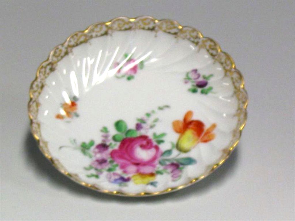 Sous-tasse de porcelaine blanche décorée de petites fleurs et 1 frise dorée de rinceaux en bordure festonnée , diamètre base: 7,5 cm , estampille bleue à l’initiale D couronnée, petite feuille dorée (sous base).