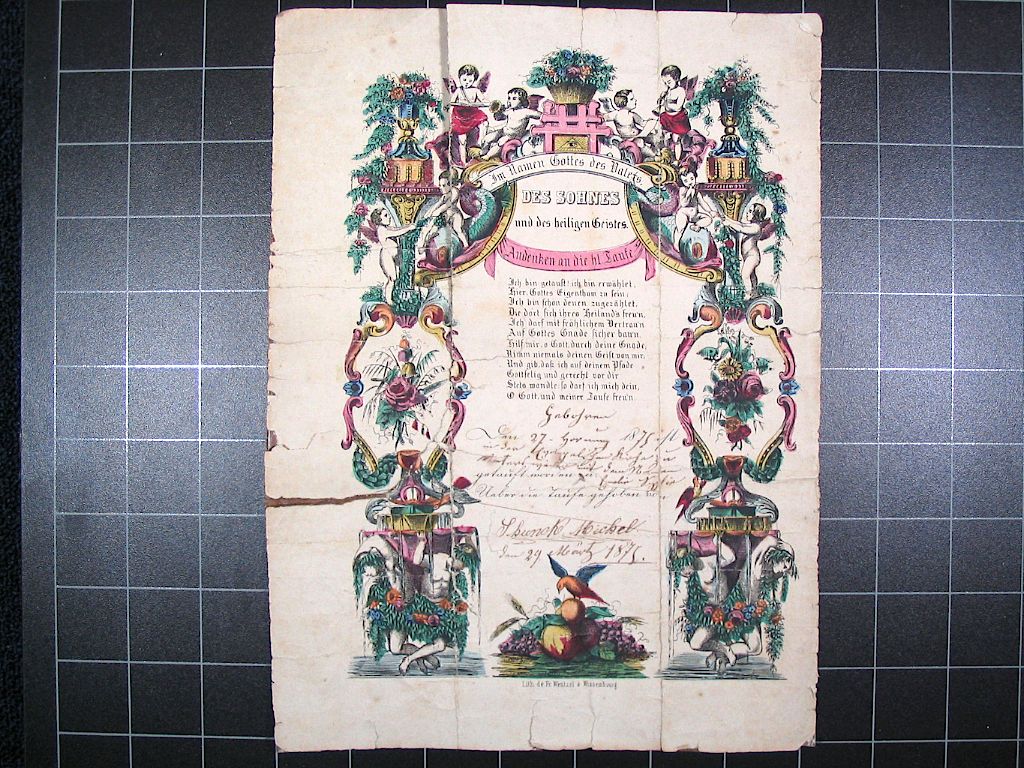Titre inscrit: « Andenken an die Heilige Taufe », texte imprimé et manuscrit entouré de fleurs, angeset oiseaux, 1875.