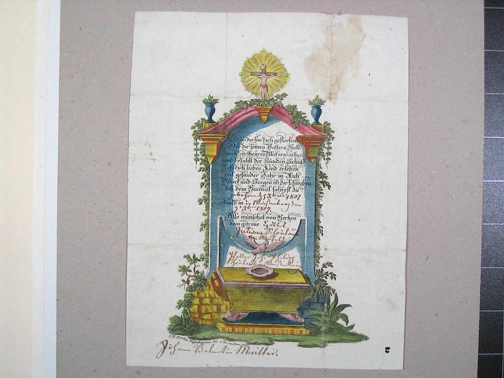 Représentation d’un autel surmonté de croix, inscription imprimée et manuscrite.
