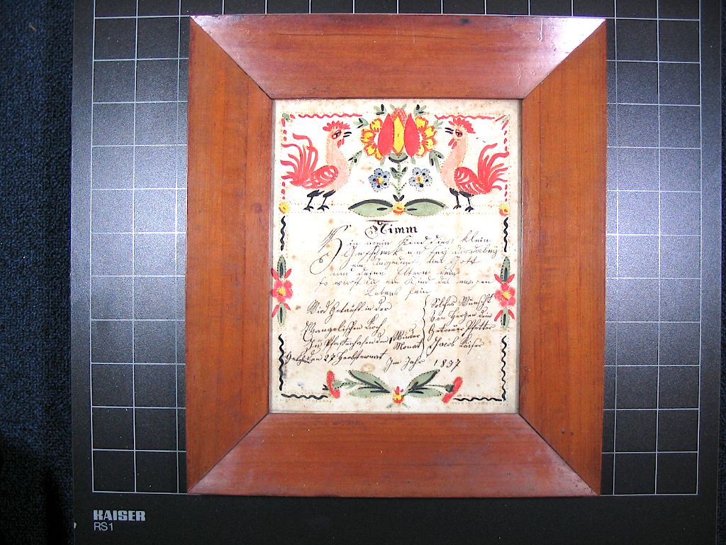 Coqs et fleurs dans les angles partie haute, couleur dominante rouge, texte manuscrit, 1897.