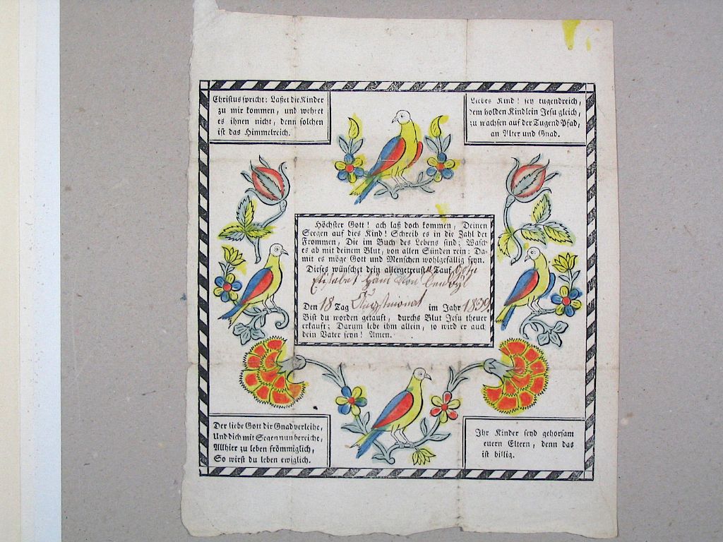 Au centre texte imprimé et manuscrit, entouré de fleurs et oiseaux, dans les angles texte imprimé, 1839.