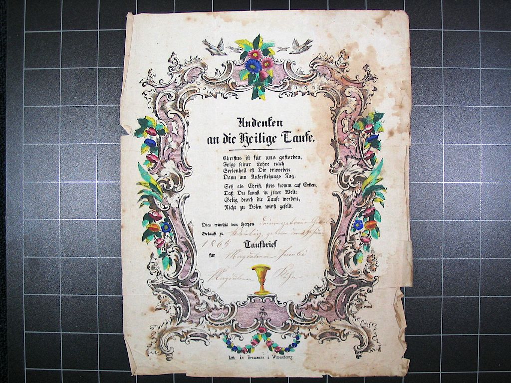 Titre inscrit: « Andenken an die Heilige Taufe », texte imprimé et manuscrit, autour ornements de motifs courbés et fleurs, dans la partie haute deux colombes, dans la partie basse un calice, 1865.