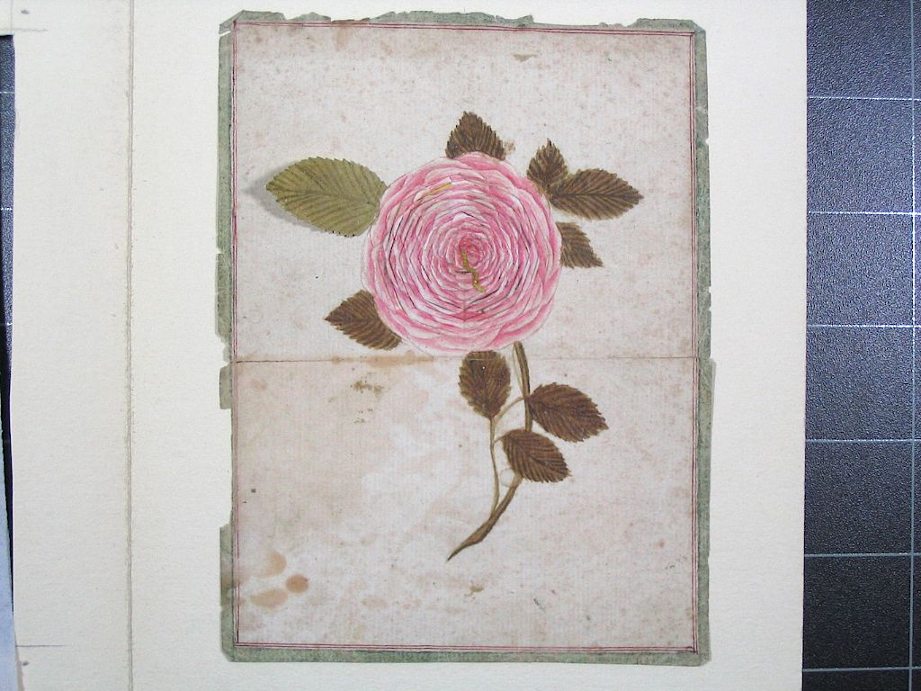 Rose découpée en spirale collée sur un papier, texte imprimé en dessous, texte manuscrit sous une des feuilles, 1791.