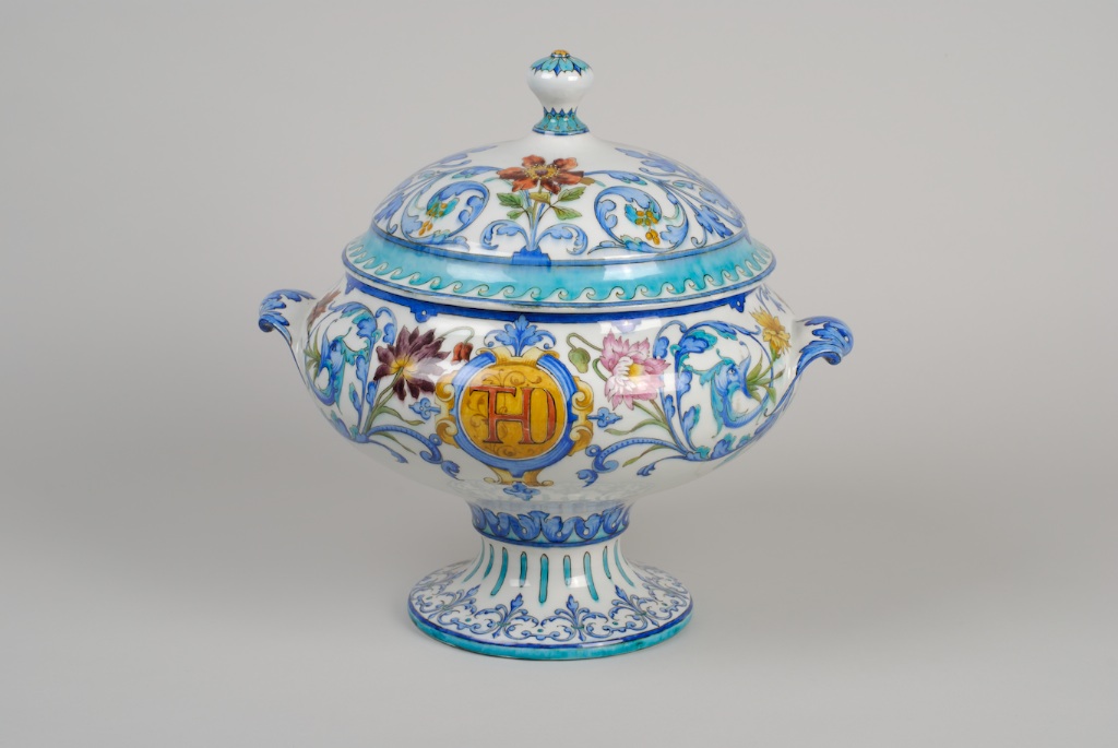 Décor floral et rinceaux sur fond blanc. Cartouche jaune avec monogramme THD. Soupière avec couvercle.