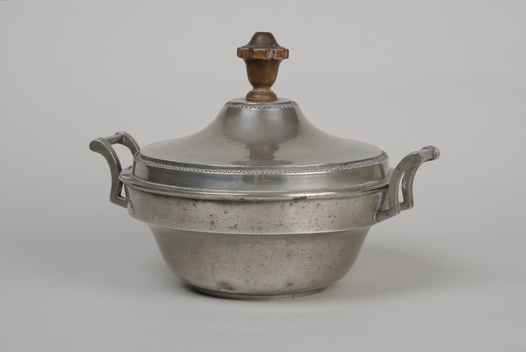 Soupière en étain à deux anses galbées et guillochées, une anse remise en place postérieurement, rangs de perles, couvercle à prise en bois tourné. Poinçon du potier d’étain de Barr, Johann Dietz.
