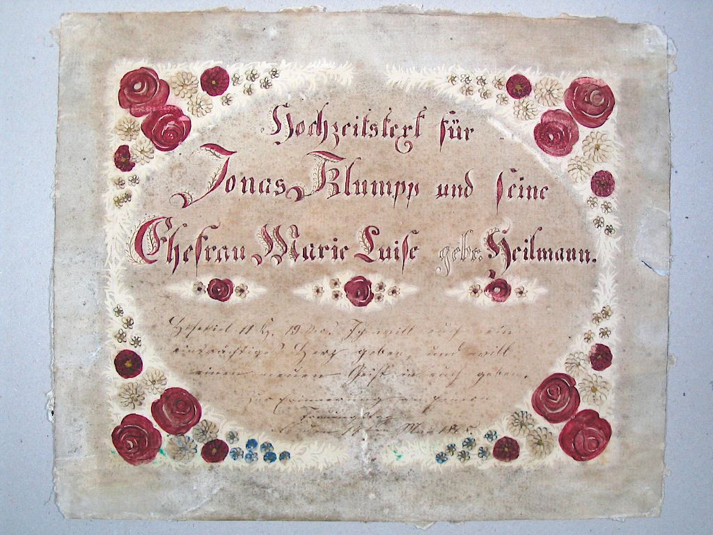 Texte de mariage manuscrit encre rouge et noire, rehaussé de roses rouges, 1868.
