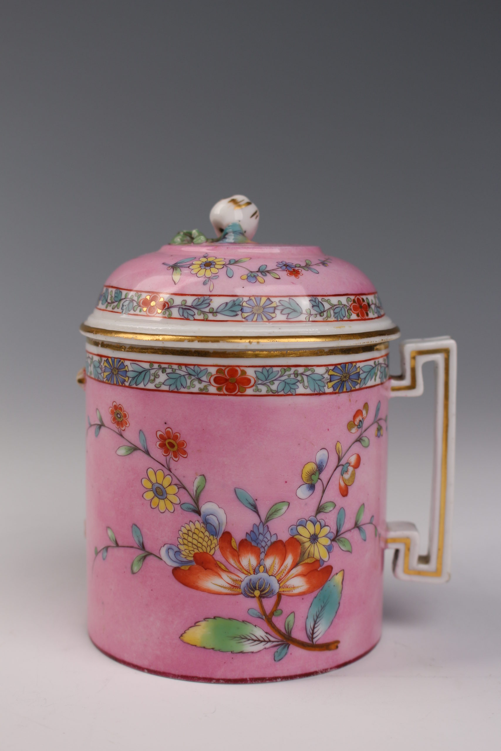 Tasse avec couvercle à deux anses en porcelaine avec une prise en forme de pomme sur le couvercle. Elle présente un décor de petit feu polychrome de fleurs des Indes sur fond rose avec des galons de fleurs et liserés or. L’anse de forme rectiligne est d’exécution fine.