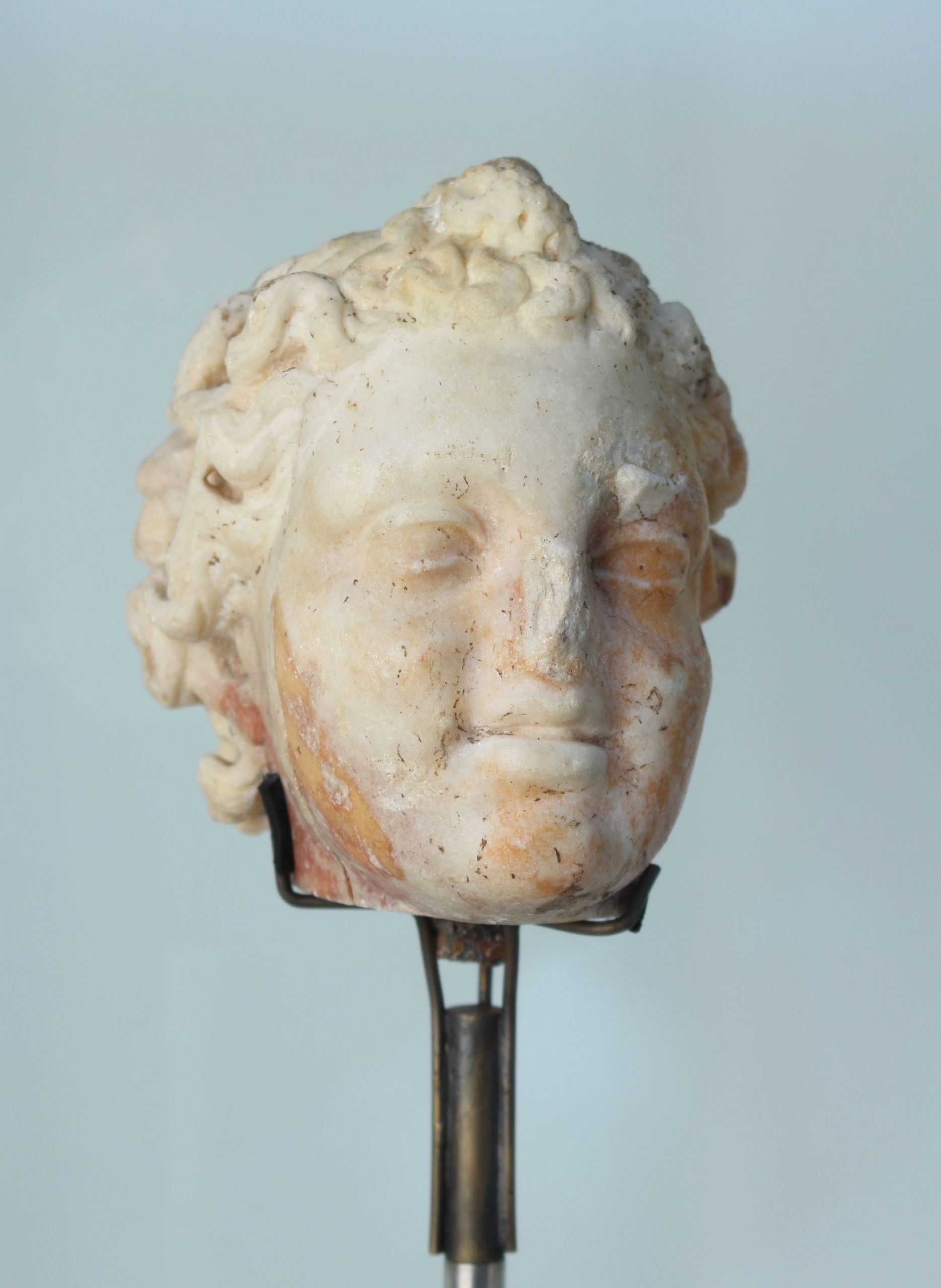 Tête d’enfant d’une excellente facture aux cheveux courts bouclés, yeux en amandes, joues et lèvres pleines. Cette tête a été découverte fortuitement à Tarquimpol, rue de l’Etang en 1950.