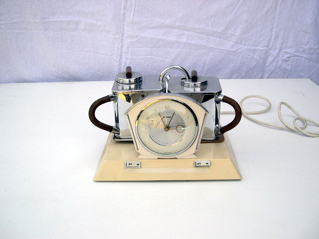 Socle en plastique ivoire avec réveil dans cadre chromé et deux récipients carrés en métal chromé, anses en bois.