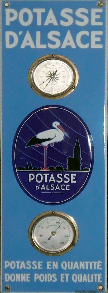 « Potasse d’Alsace ». « Hansi ». En Alsace, la découverte de la potasse en 1904 conduit les sociétés d’exploitation minière à créer une société commerciale destinée à exporter cet engrais dans le monde entier. La SCPA (Société Commerciale des Potasses d’Alsace) est à la recherche d’un symbole pour identifier sa marque de sels potassiques. En 1919, le choix se porte sur la cigogne, emblème typiquement alsacien. Véritable logo avant l’ère de la communication, la cigogne marquait tous les points de vente de la potasse sous sa forme d’ovale ou était apposée sur de multiples supports publicitaires: calendriers, cartes postales, assiettes… La collection de plaques émaillées, thermomètres et baromètres, acquise en 1988 complète les collections d’histoire industrielle de l’Ecomusée d’Alsace, témoigne des transformations de la société alsacienne du XXème siècle et du dialogue entre société rurale et industrielle.