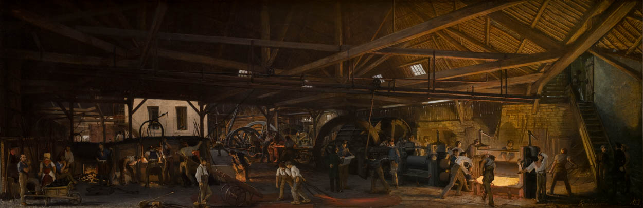Ce tableau, exposé au Salon de 1938 et à l’Exposition universelle de Paris de 1855, est l’œuvre de l’artiste François Bonhommé (1809-1881). Il étudie, dès 1837, la forge à l’anglaise d’Abainville située sur l’Ornain dans la Meuse. Cette œuvre panoramique, particulièrement soignée, présente l’intérieur d’une halle de production. François Bonhommé y reproduit avec précision les équipements techniques. Le métal est d’abord réchauffé dans les fours puis laminé entre deux cylindres, aplati en tôle de fer ou découpé en fers marchands et rails.