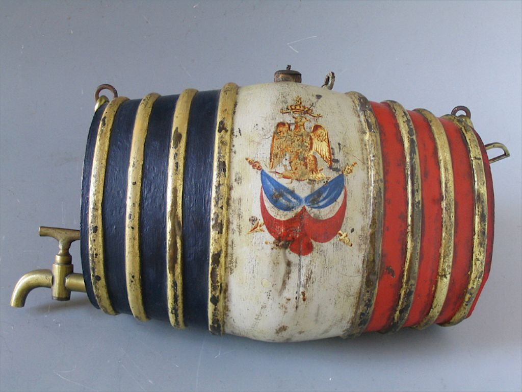 Le tonnelet est en tôle étamée, de forme convexe, peint aux couleurs de la France (bleu-blanc-rouge), il porte à l’avant, un robinet de laiton, surmonté du numéro du régiment auquel appartient la cantinière, à l’arrière est inscrit le nom de la cantinière, chaque côté est encerclé par des arceaux dorés, un bouchon de liège surmonté d’un couvercle métallique et d’une chaînette se situe sur la partie haute du tonnelet, la banderole de cuir verni noir est arrimée au tonnelet par deux mousquetons en laiton.