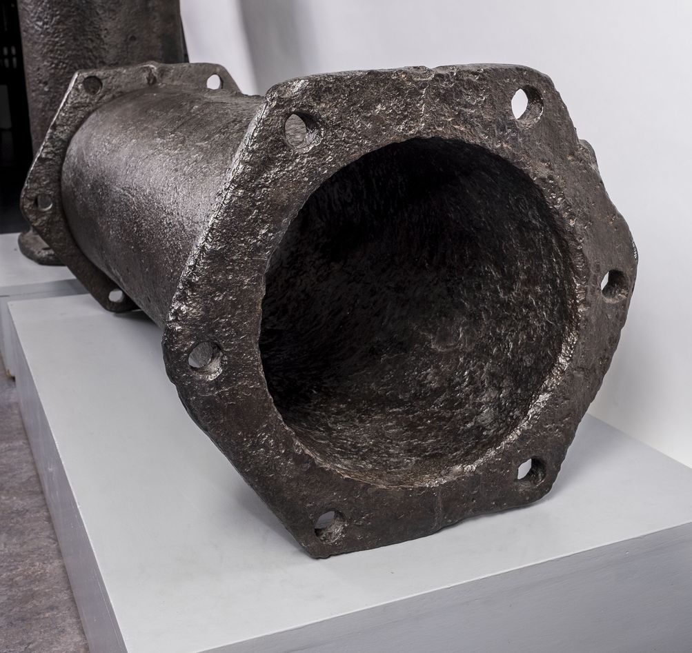 tuyaux en fonte, auparavant assemblés entre eux par des joints vissés et des brides en cuir, servant de canalisation pour le réseau hydraulique des fontaines et jets d’eau du domaine de Versailles