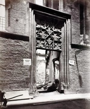 Partie inférieure du tympan rectangulaire à réseau aveugle qui surmontait le portail méridional de l’église des Dominicains de Strasbourg (détruite en 1870). Photo de Winter du portail méridional du Temple Neuf après le bombardement de 1870 :