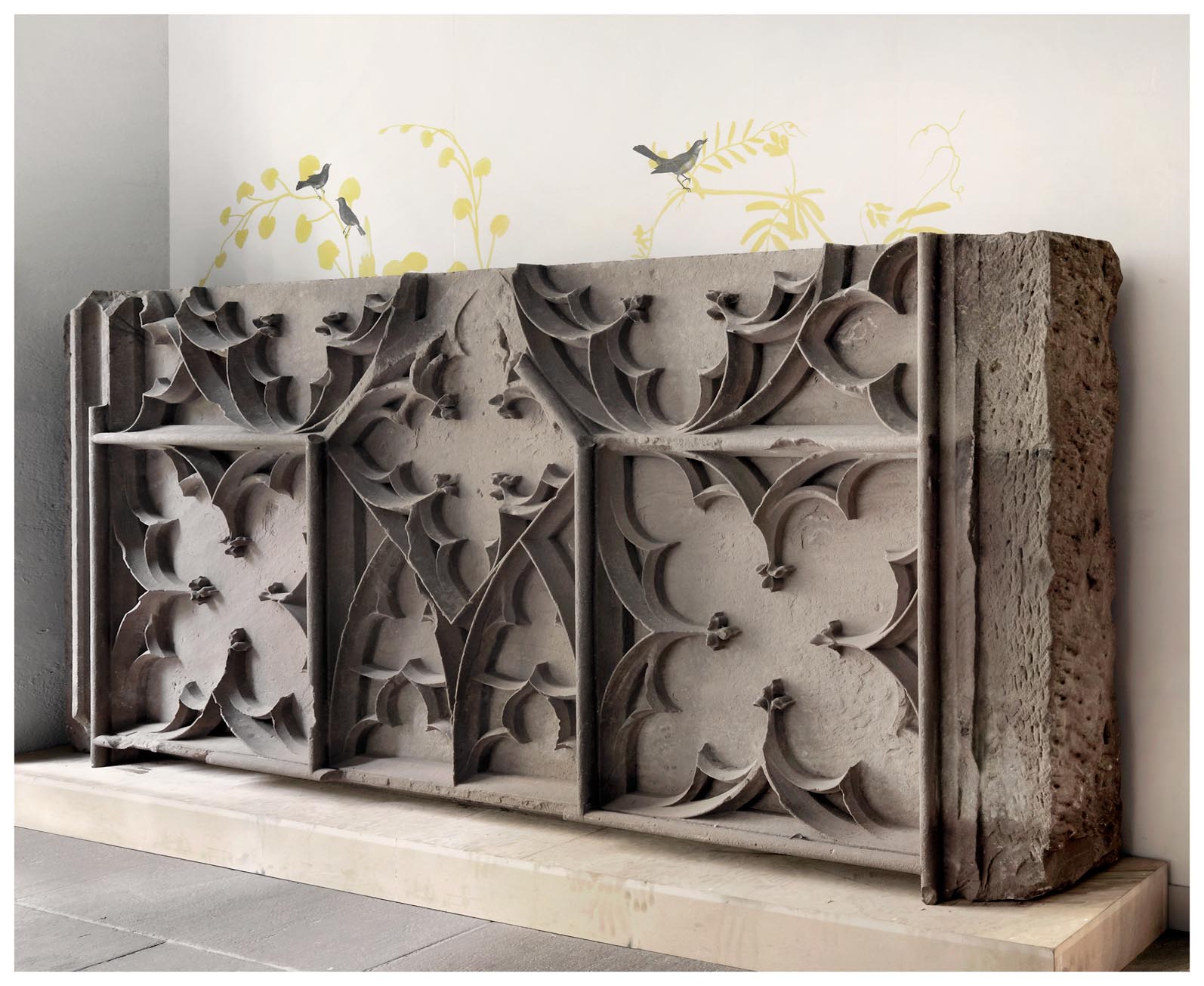 Partie inférieure du tympan rectangulaire à réseau aveugle qui surmontait le portail méridional de l’église des Dominicains de Strasbourg (détruite en 1870). Photo de Winter du portail méridional du Temple Neuf après le bombardement de 1870 :