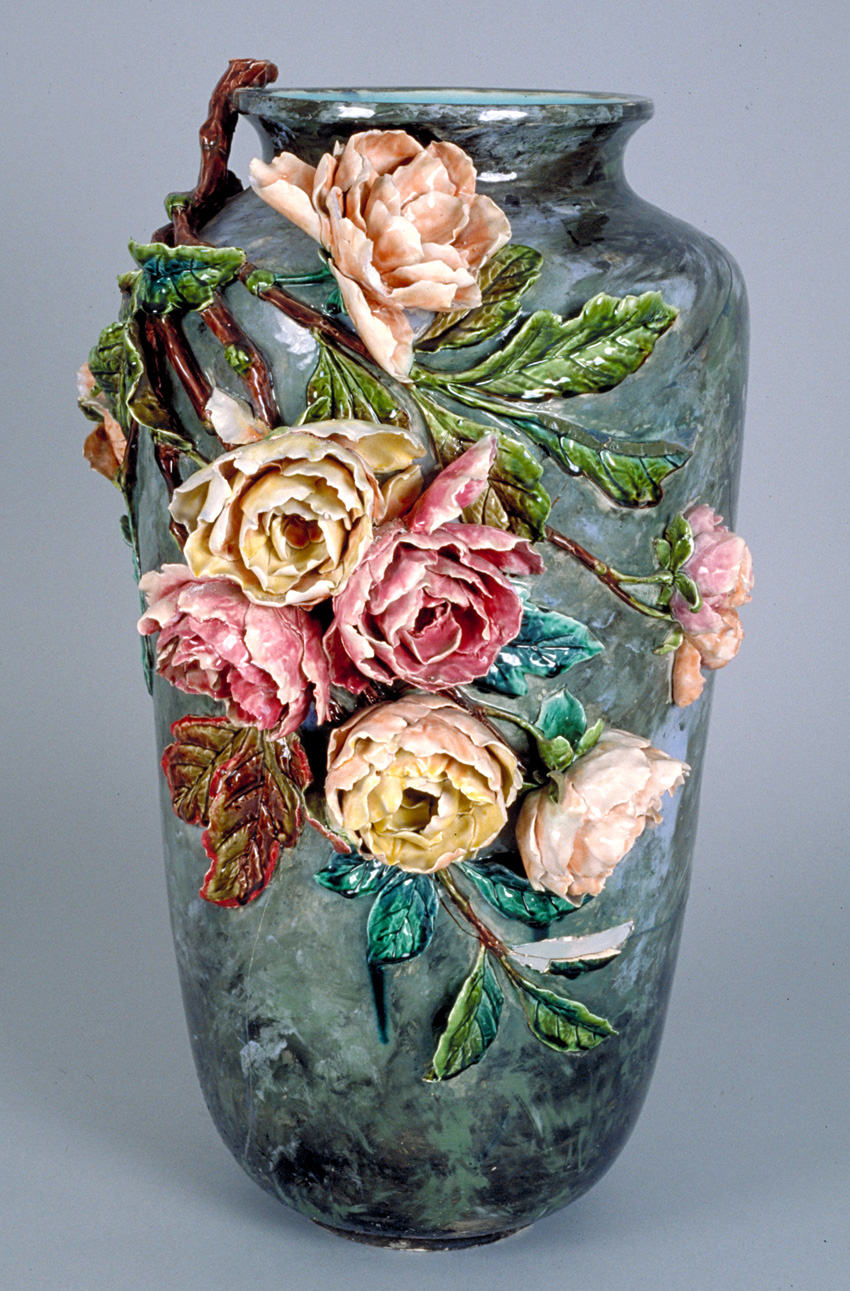 Grand vase avec fleurs en relief, signé Victor Kremer, artiste employé à la manufacture de Sarreguemines