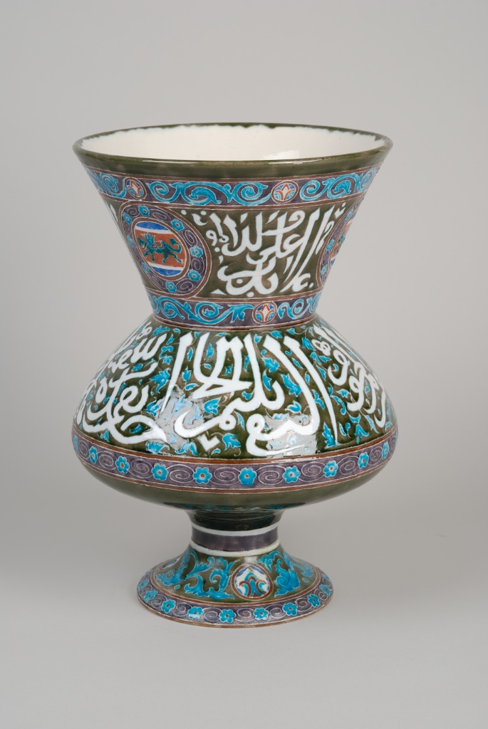 Vase en forme de lampe de mosquée. Décor d’inspiration islamique, en registre avec caractères arabes. Fond couleur bronze. Céramique inspirée d’une lampe de mosquée en verre émaillé à décor calligraphié provenant d’Egypte ou de Syrie fin XIVème siècle.