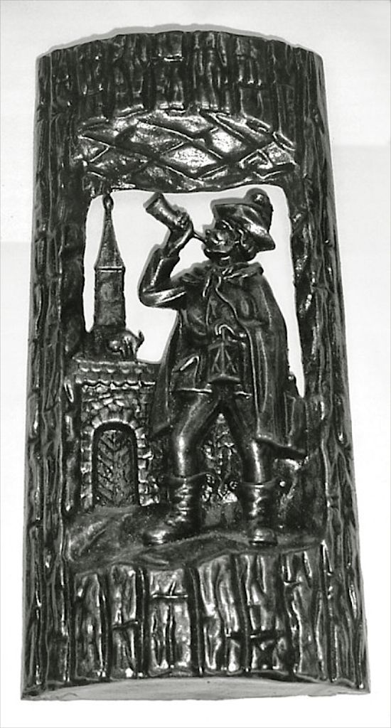 Haut-relief ajouré représentant un veilleur de nuit effectuant sa ronde. A l’arrière plan se dessinent les remparts de la ville, en pierres taillées, dans lesquels se découpe une porte. Au dessus des remparts, s’élève un clocher surmonté d’un lanternon. Un chat se promenant sur les remparts fait le dos rond. Le veilleur de nuit se tient des trois-quarts face, présentant son profil gauche. Il sonne le couvre-feu à l’aide d’une trompe qu’il porte à ses lèvres avec sa main droite. Dans sa main gauche, il tient une lanterne. Il porte une veste, des bottes, un pantalon, une cape et un chapeau à haute calotte bosselée. De la poche de sa cape émerge une bouteille. La scène se découpe au centre d’une plaque imitant un tronc d’arbre, de forme rectangulaire et concave, dont la surface présente l’aspect de l’écorce du bois. Réalisé à partir d’un modèle original non identifié. Muni d’un crochet d’attache.