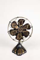 Ventilateur électrique en laiton de style Art-Déco avec des pales ornées de têtes de femmes en peinture dorée. Le pied est orné de motifs géométriques.