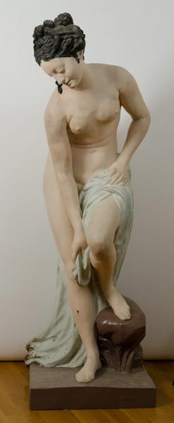 Personnage féminin nu debout, penché en avant, avec une draperie sur sa cuisse gauche et le pied gauche posé sur un rocher.