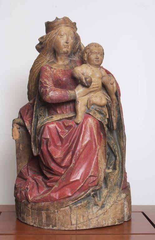 La Vierge est assise sur un coussin placé sur un banc, elle porte l’Enfant sur son genou gauche. Celui-ci semble vouloir se déplacer en prenant appui sur sa jambe repliée. Il tient d’une main un pan du manteau de sa mère, et de l’autre un fruit, peut-être une grenade (symbole du corps du Christ, au jus rouge comme son sang et aux multiples graines, unies comme les fidèles au sein de l’Église). On devine un collier de corail autour de son cou, symbole du sang du Christ dans la tradition chrétienne. Les drapés sont sculptés avec précision, notamment les plis cassés de la robe et du manteau de la Vierge, qui contrastent avec la douceur et la rondeur des traits des protagonistes. Les postures des personnages, les drapés et la chevelure de la Vierge animent le groupe. Les lignes créent un arrondi de la tête aux pieds de Marie, enveloppant la mère et l’enfant. Ces caractéristiques sont communes à plusieurs Vierges à l’Enfant exécutées à la fin du XVe siècle dans le Rhin supérieur.