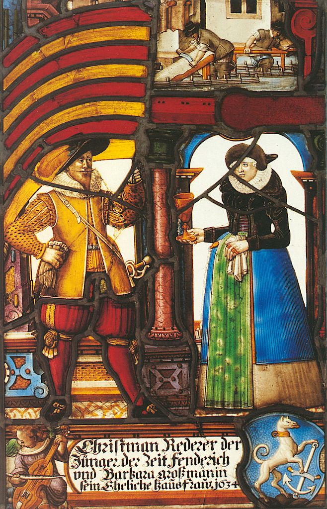Le vitrail, que la légende du cartouche date de 1634, sort très certainement d’un atelier local. Par certains côtés son style est proche d’un vitrail de 1604, réalisé pour l’arrière petit-fils de Sébastien Brant et que possède également le Musée Historique. Ils appartiennent à la catégorie des petits vitraux « d’appartement » qui, de 1500 à 1700, prennent la succession des vitraux d’église. A Strasbourg, une officine de peintres-verriers d’origine suisse, les Linck, travaille pour le Magistrat et pour la Bourgeoisie dès 1580. La présente pièce a un triple intérêt. D’abord historique car le personnage de Christmann Rederer (ou Roederer) Le Jeune est connu. Fils et petit-fils de tanneur, il est dix fois élu au Grand Sénat (1649-1666). Dans la corporation des Tanneurs, il occupe la fonction de porte-bannière: représenté comme tel, il est fort probable que le vitrail a été commandé pour célébrer l’événement. Intérêt sociologique que nous livrent les archives: Christmann Rederer, outre une durée de vie nettement au-dessus de la moyenne pour l’époque (1596-1670), se marie trois fois et totalise trente enfants, dont quatorze de Barbara Grossmann, sa première femme. Intérêt ethnographique enfin, par le minutieux rendu des costumes des deux protagonistes ainsi que par la scène de grattage des peaux. Un type d’acquisition particulièrement enrichissant pour un musée soucieux d’illustrer toutes les facettes du discours historique.