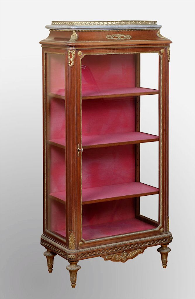 Meuble style Louis XVI vitré sur le devant et les côtés, acajou finement mouluré, 3 étagères,intérieur recouvert de tissu rose pourpre 1 plaque de marbre gris mouluré (H: 2,5 cm, p: 34 cm, L: 59,2 cm) avec une galerie en bronze ajouré sur le haut, qui n’est pas d’origine et dont le retour derrière est interrompu à 10,5 cm du bord et se termine en oblique (H: 2,2 cm, L: 29 cm, P: 53,5 cm), applications de bronze (guirlandes et dentelures rubannées, oves, fleurs, baguette moulurée) vissé , estampille gravée quatre fois: « LDROMARD (le « L » dans l’angle supérieur droit ressemble presque à un « G ») PARIS ».