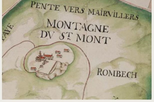 Fig. 4 – Carte topographique des bois appartenant au prieuré du Saint-Mont, vers 1777, papier, encre et aquarelle (détail). Archives départementales des Vosges, 2 Fi 3442