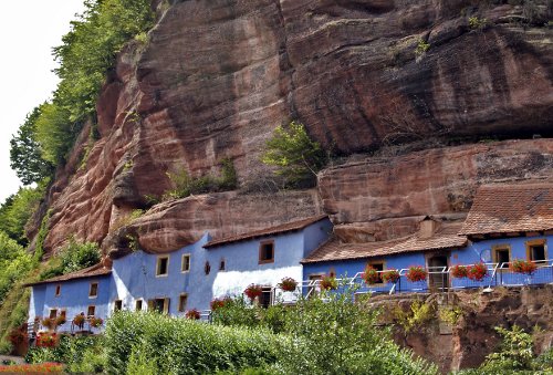 Les Maisons des rochers de Graufthal sont insérées dans une falaise de plus de 30 m de haut. Les excavations naturelles dans les rochers ont d’abord été utilisées comme entrepôt par l’abbaye de bénédictines implantée au cœur du village, puis ont servi d’habitation aux villageois après le départ des dernières nonnes au 16e siècle. Catherine Ottermann, décédée en 1958, a été la dernière troglodyte à occuper une de ces maisons bleues. En flânant à l’intérieur des maisons Ottermann et Weber, le visiteur peut imaginer la vie de leurs occupants au début du 20e siècle. Dans la troisième maison, l’exposition « Des rochers et des hommes », à travers de magnifiques photographies de Frédéric Engel, permet de découvrir les rochers des Vosges du Nord selon 5 approches : les traces préhistoriques et antiques, les maisons et grottes habitées, les châteaux forts troglodytiques, les sites militaires stratégiques ainsi que les rochers et légendes. Une invitation à la randonnée…