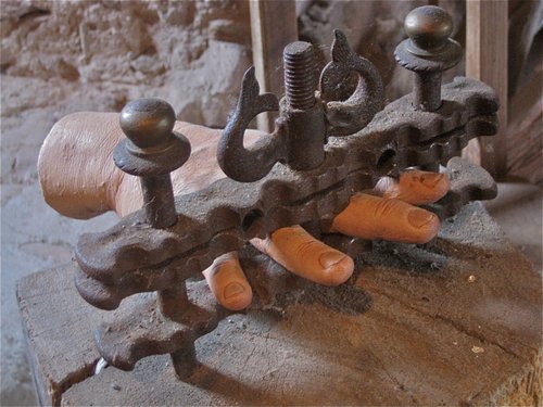 – la salle de garde, permettant d’assister aux interrogatoires, avec une collection d’instruments de torture.